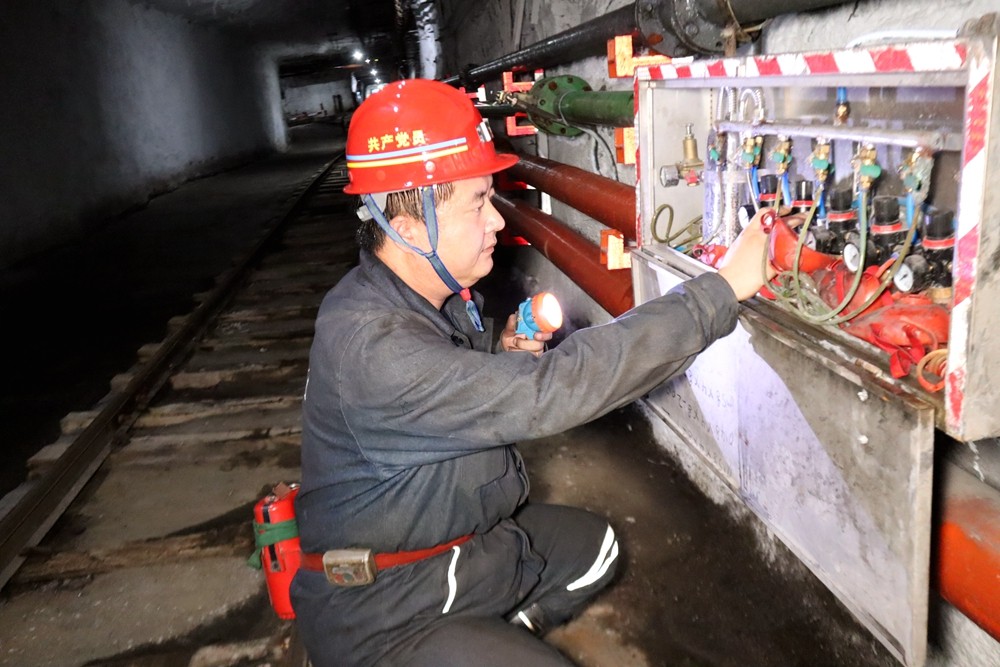 图为职工正在检查矿井自救系统是否正常