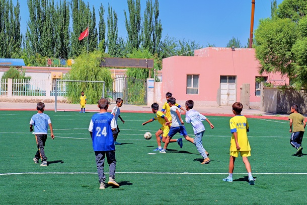 图为孩子们在新修建的操场踢足球